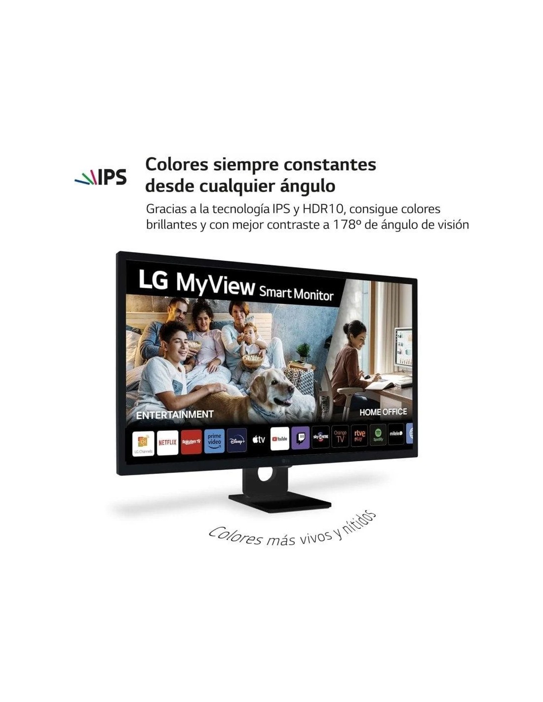 LG MyView Smart TV está diseñado para el trabajo y el entretenimiento. Mira tus series favoritas fácilmente desde múltiples plataformas de streaming y configura tu espacio de trabajo de manera rápida, con ordenador o sin él. El único con el que disfrutar de más contenidos en streaming como: RTVE, Mitele, Orange, Netflix, Prime Video, Disney+, Apple TV, YouTube, videojuegos y mucho más. LG MyView Smart Monitor WebOS23, más fácil, intuitivo y seguro. Gracias a webOS23 podrás gestionar tanto tus aplicaciones como las más recientes, además de comprobar las notificaciones fácilmente.